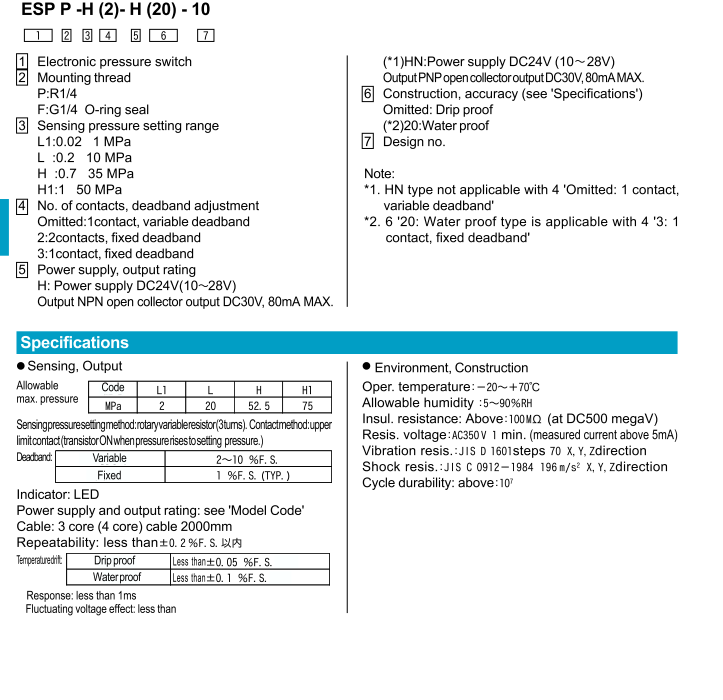 Công tắc áp suất Tokimec - Model PRESSURE SWITCH ESPP