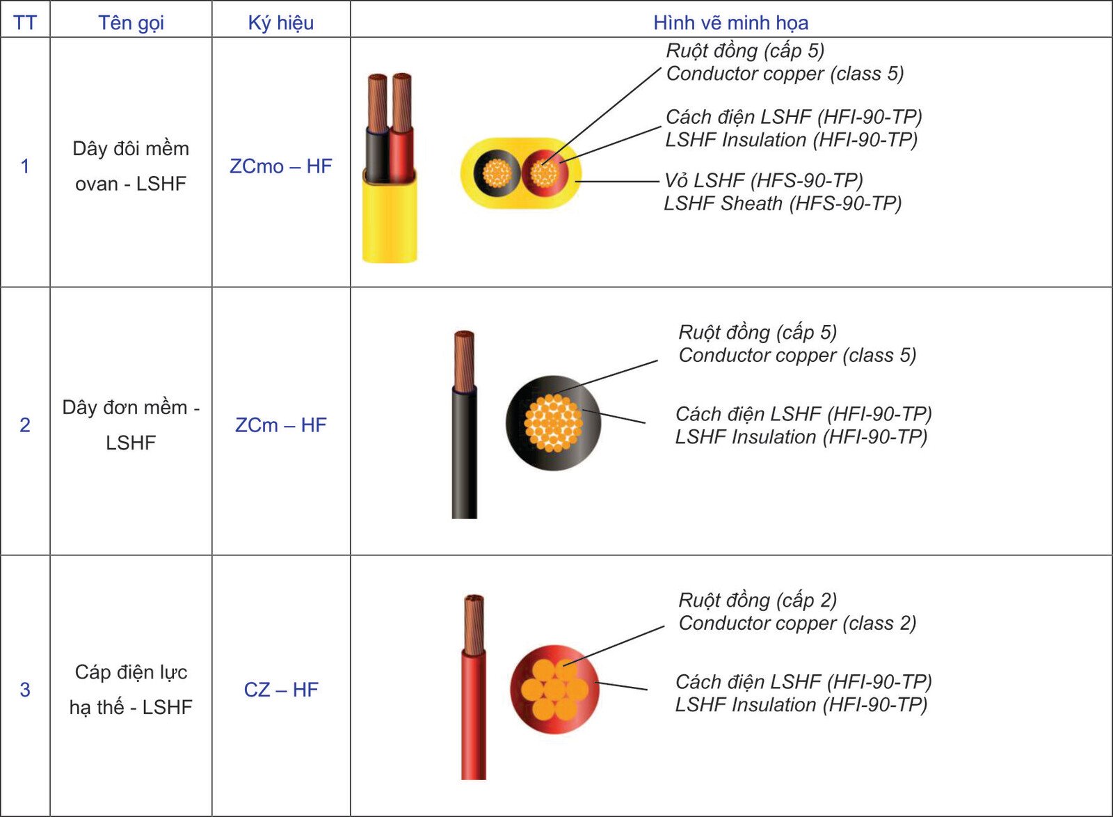 Dây cáp điện ruột đồng bọc nhựa LSHF (có hoặc không có vỏ), có đặc tính chậm cháy ít khói không halogen, dùng cho các thiết bị điện dân dụng.