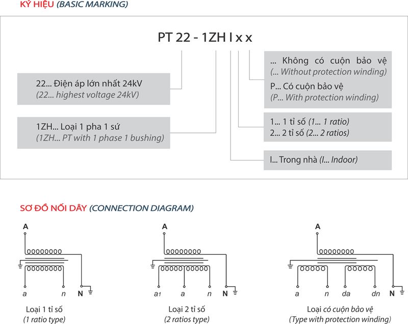 Máy biến điện áp PT22-1ZHIxx-F được thiết kế một hay hai tỉ số, có thể thay đổi tỉ số bằng cách đổi nối phía thứ cấp.