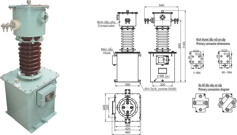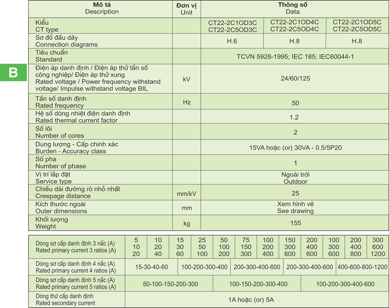 - Máy biến dòng đo lường trung thế 1 pha ngoài trời kiểu ngâm dầu CT22, 2 lõi, 3(4,5) tỷ số, 5P20