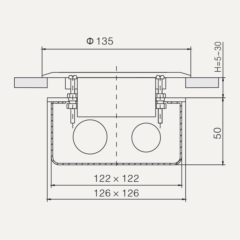 - Kích thước âm sàn (LxWxH): 126mm x 126mm x 50mm
