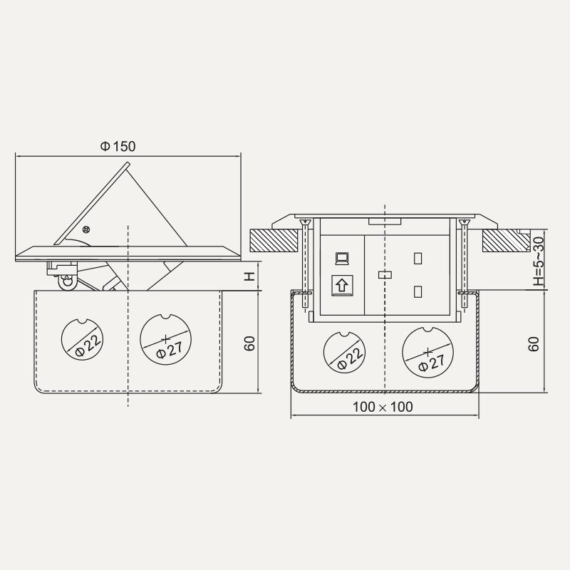 - Kích thước âm sàn (LxWxH): 100mm x 100mm x 60mm