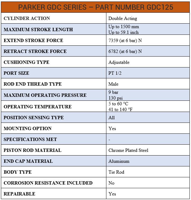 1) Thông số kỹ thuật Xi lanh khí nén Parker GDC-N125*175