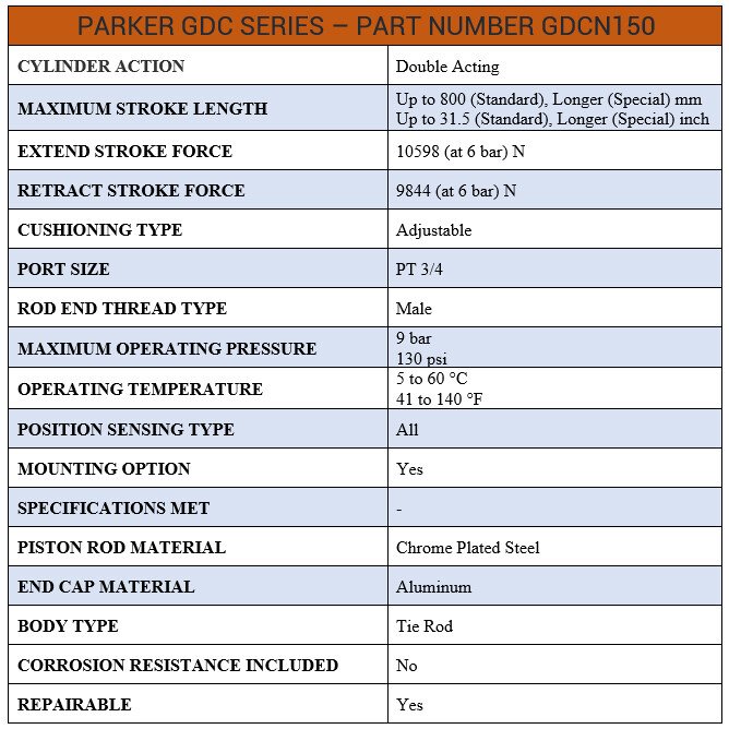 1) Thông số kỹ thuật Xi lanh khí nén Parker GDC-N150*150